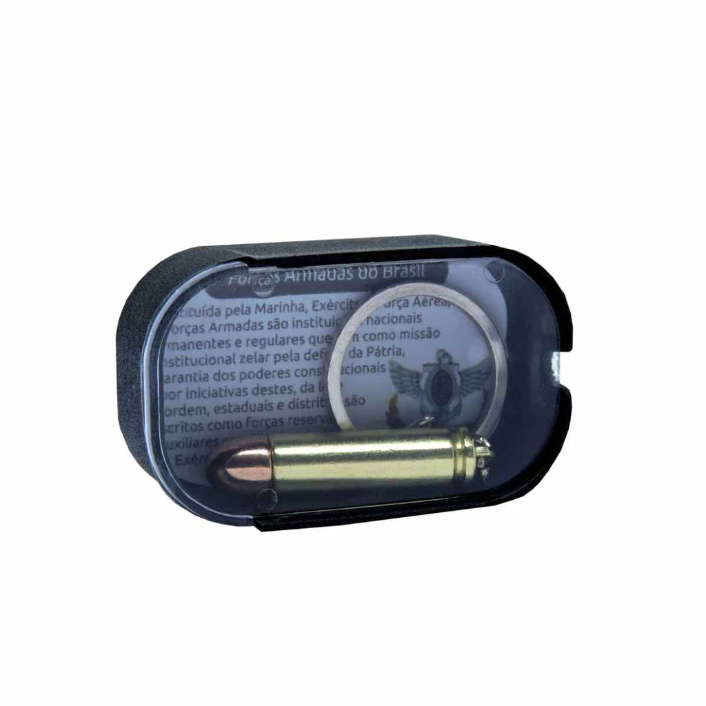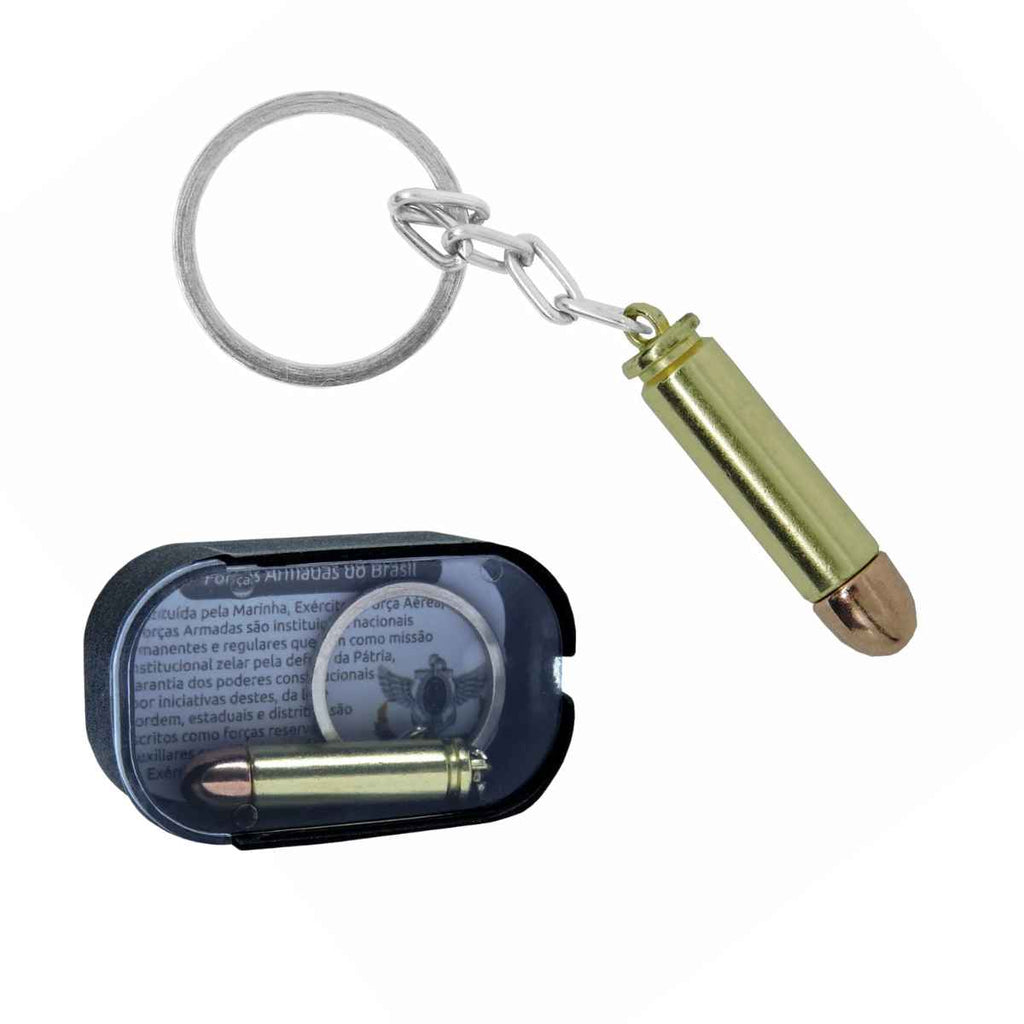 Chaveiro inspirado no calibre de uma munição que é a medida padrão do seu projétil.