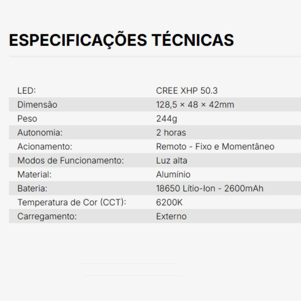 Seu design incorpora uma lente TIR de baixa angulação, que maximiza o alcance do feixe, proporcionando visibilidade superior em ambientes desafiadores. A praticidade está garantida com o botão de acionamento remoto, que pode ser configurado para modo constante ou momentâneo, facilitando o controle em situações dinâmicas.