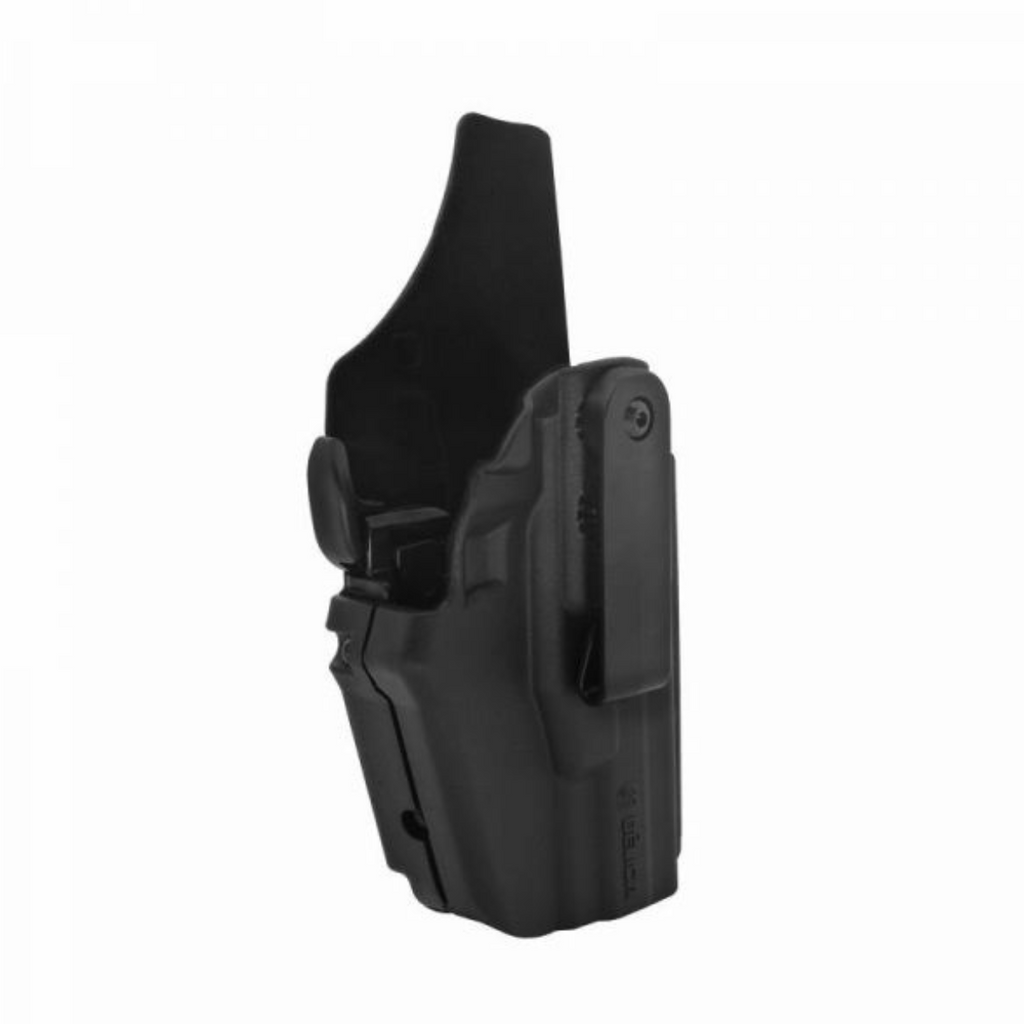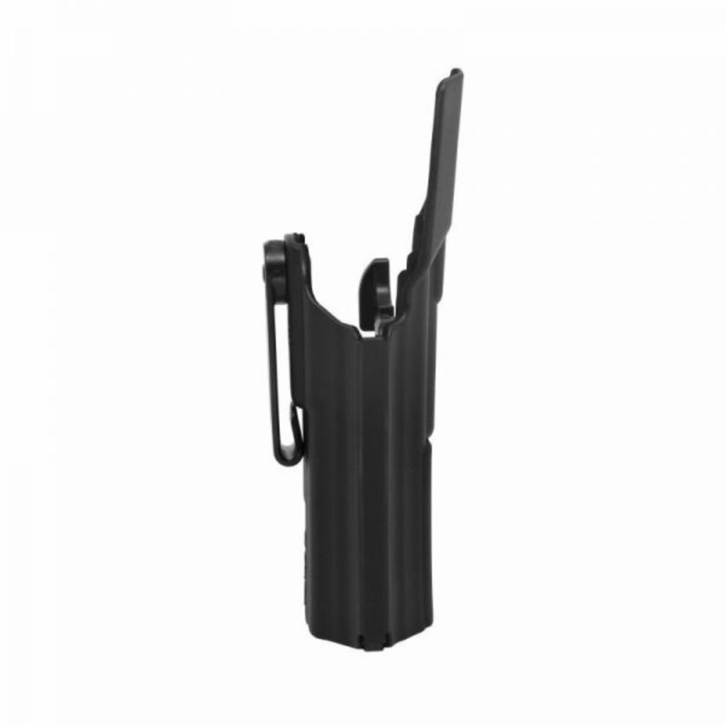 Sistema de catraca rotativa que possibilita a rotação do coldre, permite ajuste do ângulo e maior conforto no saque da arma;