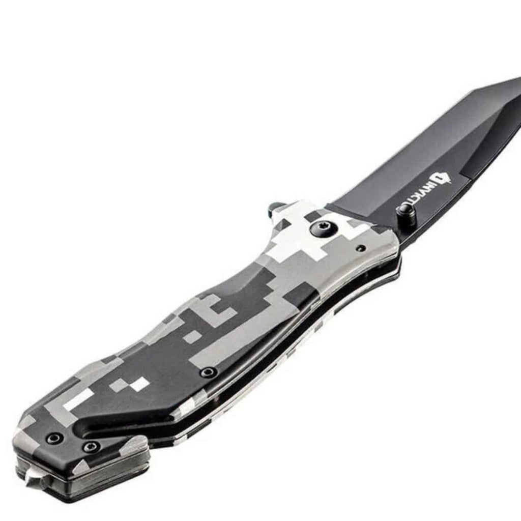Possui lâmina em aço inoxidável 420, de maior resistência a impactos e maior durabilidade, cabo em óxido de alumínio com camuflado digital urbano, clip tático, pomo metálico (quedra vidro), corta cinto no cabo e abertura fácil e rápida assistida por mola (spring assisted).